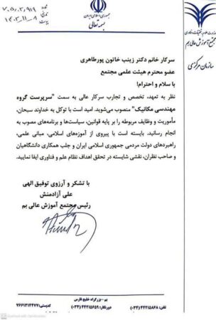 انتصاب سرکار خانم دکتر زینب خاتون پورطاهری به سمت سرپرست گروه مکانیک مجتمع