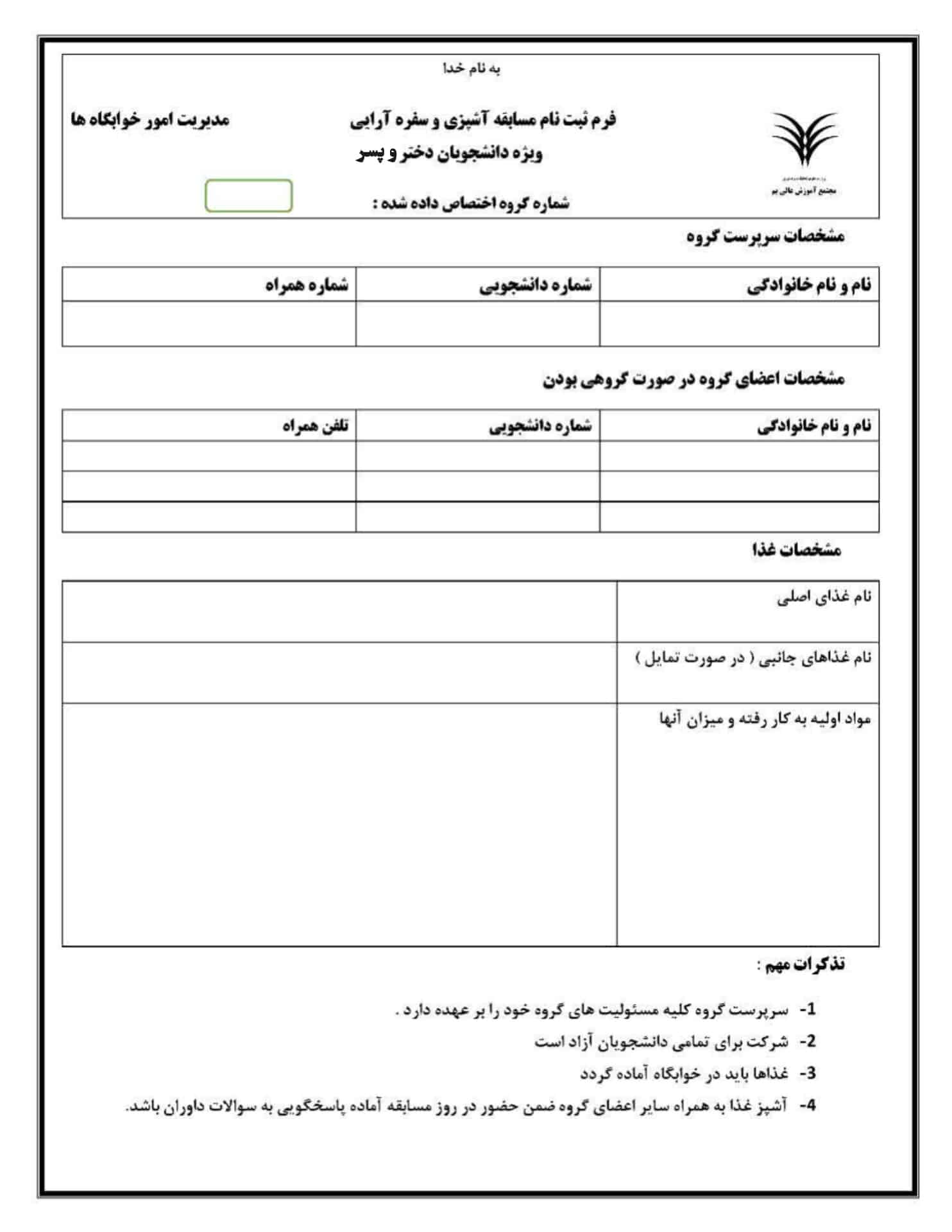 گروه های متقاضی شرکت در مسابقه فرم مربوط به مسابقه آشپزی را حداکثر تا تاریخ 1404/02/08 از دفتر خوابگاه سرکار خانم وحیدی تحویل و تکمیل نمایند.