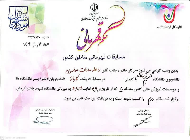 به گزارش روابط عمومی مجتمع آموزش عالی بم، خانم موسوی با مربیگری خانم لعیا ولندیاری در این دوره از مسابقات در وزن منهای ۵۵ کیلوگرم که از تاریخ یازدهم تا چهاردهم آذرماه به میزبانی دانشگاه شهید باهنر کرمان برگزار شد، شرکت و ضمن کسب مقام دوم مسابقات به المپیاد فرهنگی ورزشی دانشجویان سراسر کشور که در تابستان ۱۴۰۵ به میزبانی دانشگاه فردوسی مشهد برگزار می شود، راه یافت.