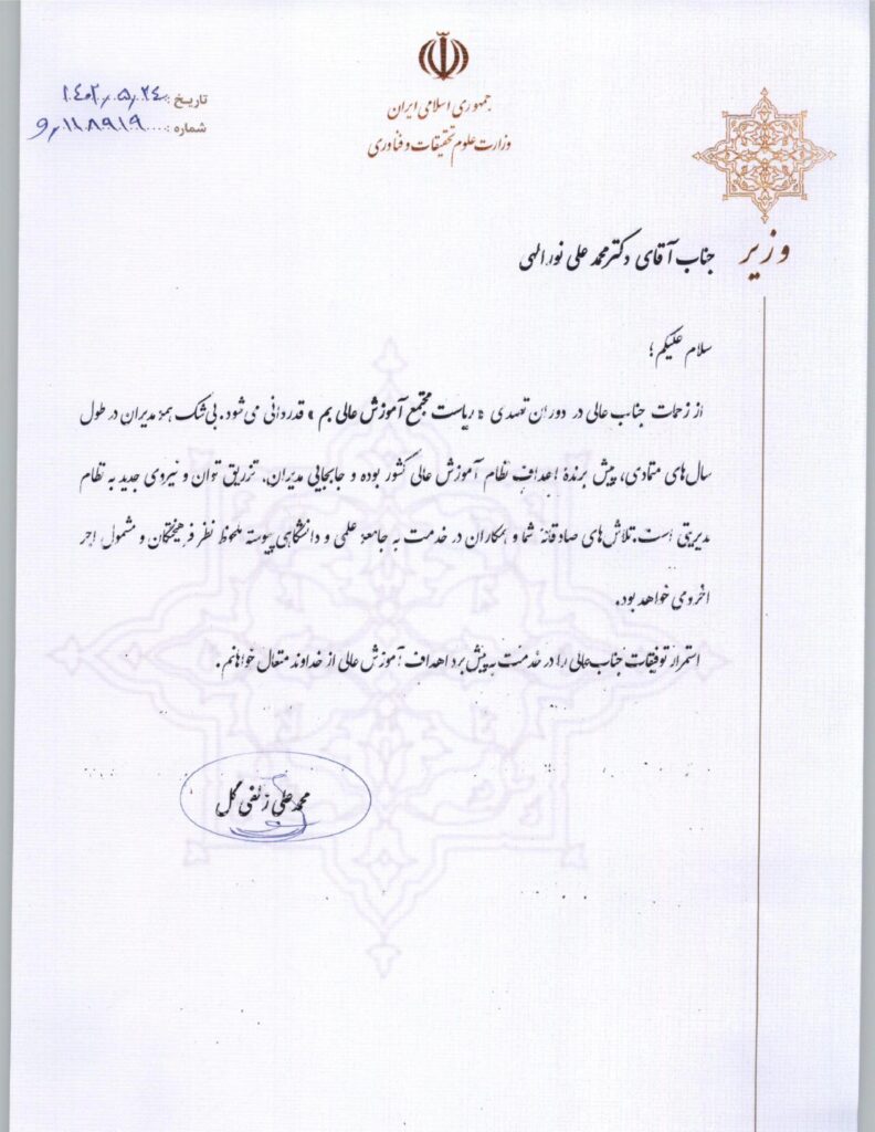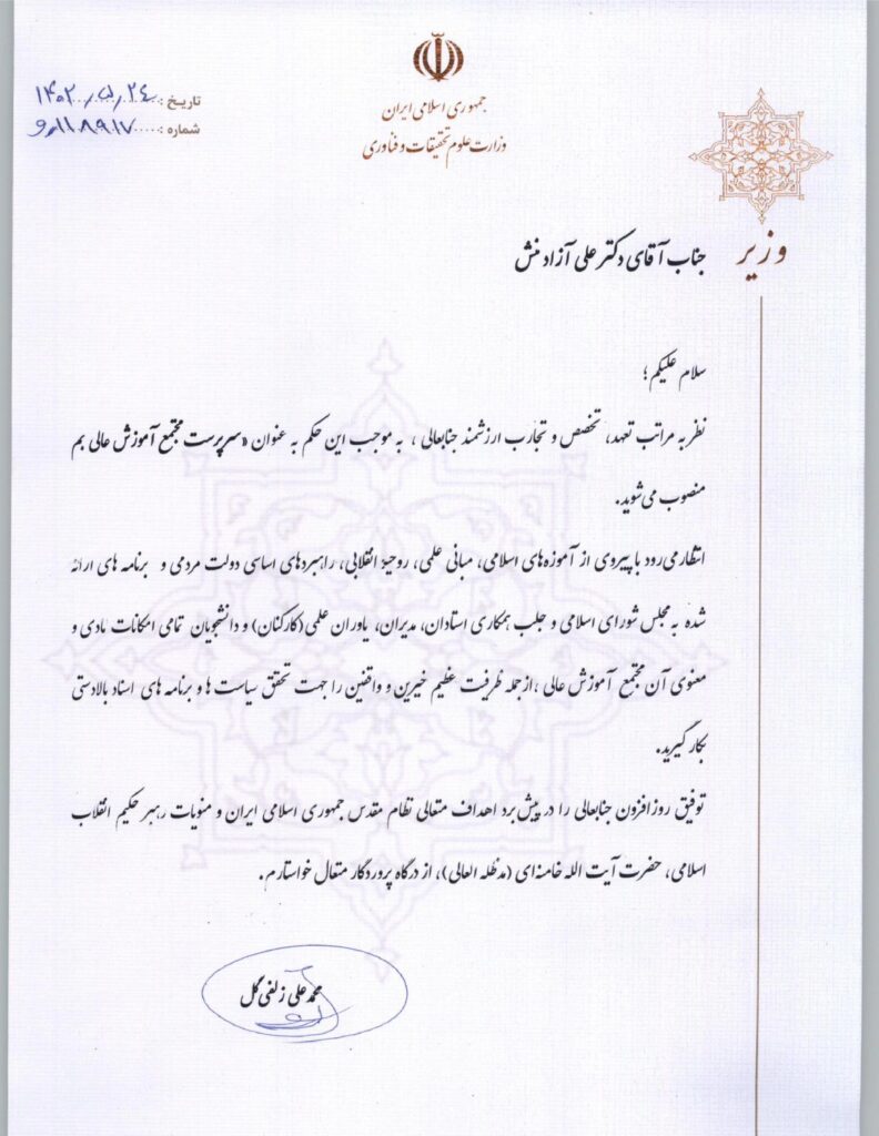 وزیر علوم، تحقیقات و فناوری با صدور حکمی، دکتر «علی آزادمنش» را به عنوان “سرپرست مجتمع آموزش عالی بم” منصوب کرد